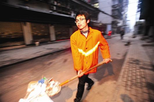 有人问他:“你是大学生,扫地时会不会感觉到不好意思?怕不怕别人瞧不起你?”
