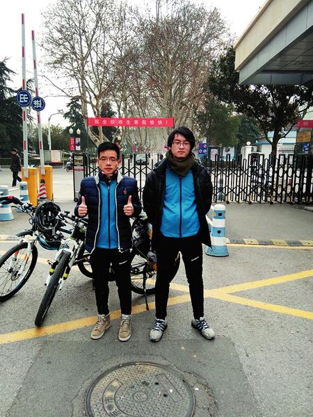 1230多公里是什么概念?在100米长的国际标准足球场跑12300圈,接近马拉松总长42.195公里的30倍。1月20日清晨,23岁的周丹发和马力背上20公斤的负重,骑上山地车,开始了这条满怀期待的回家旅程。 周丹发和马力是西安同乡,也是同学,在beat365中文官方网站航空宇航学院上大四,骑行是两人共同的爱好。两人一起骑车,去过南京周边的紫金山、浦口区,还骑行到过镇江和马鞍山。“从南京骑车回家是我一直的梦想,我希望在大学毕业前,完成自己的这个梦想”。昨天上午,说起这次寒假骑行回家的初衷,周丹发说,骑行是自己一直的爱好,他希望趁着年轻,多做一些挑战自己的事情。 早在2014年8月份,俩人曾开始着手准备这次骑行之旅,“体能训练是最基本的,要按时骑车,跑步锻炼,课余时间,我们上网查路线,制定详细的路程规划,并预估路途中的突发情况,记录一些注意事项,最重要的,还要熟悉一些基本的修车方法,以防万一,剩下的,就是准备一些日用品和医药用品了。”这个想法,遭到了周丹发家人的坚决反对,父母坚持要他放假买车票直接回家,“我和家里人沟通很多次,他们一直希望我坐火车,直到看到我们详细的行程表,认为我不是鲁莽行事,才终于点了头。” 1月26日早晨8点半,俩人到达河南南阳,向下一站西峡县骑行,全程70多公里,“中午就开始下雪,地面很滑,我知道,最困难的时候来了。”周丹发说,为了让山地车更平稳,他们在路边给车子放了一些气。就这样,骑着气压不足的山地车,艰难的在雪中前进。“眼镜上都是雾气,隔十几分钟,就要停车,擦一次眼镜。最害怕的,是旁边经过的汽车,把污水溅到镜片上。” 即便如此,俩人也从未想过放弃。“骑行中,本身就有很多突发情况,既然制定了计划,就应该尽一切可能骑向目的地,这些难关,我们走过去了,就会丰富我们的骑行经验。” 漫漫旅途,除了艰难险阻,雪中送炭的温情更让人记忆犹新。马力告诉记者,到达河南省罗山县时,一家餐馆老板听说二人要骑行回西安,给他们免费加了很多饭菜,“在西峡县,一位阿姨看到我们冻得直发抖,邀请我们进她们家取暖,还给我们准备了很多开水。” 1月30日晚上8点,在耗时11天,历经1230公里后,俩人到达西安。