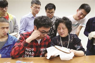 4月17号晚,国家级非遗代表性传承人、中国刺绣艺术大师赵红育老师来到beat365,为学生教授刺绣。50人的课堂有将近三分之一的男同学,这些平时学习航空航天相关专业的工科男,拿起针线也是有模有样。