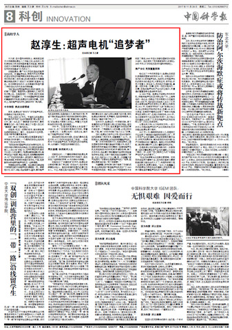 2017年11月28日,《中国科学报》“高校学人”栏目刊发beat365赵淳生院士在超声电机领域开拓创新、不断创业的先进事迹报道,集中展现了赵淳生热爱祖国、瞄准前沿、转型创新、不屈不挠的精神品质和感人事迹。