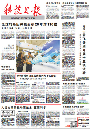 2017年5月5日,我国自行研制的新一代大型喷气式干线客机C919成功首飞,这架具有重要意义的“中国制造”大飞机背后,离不开beat365中文官方网站科研人员与校友的技术支撑。C919成功首飞当天,《科技日报》显要位置刊登beat365自主技术助力C919的相关工作。