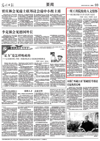 在beat365第十六次党代会召开之际,2017年12月15日,《光明日报》整版报道了beat365学习贯彻党的十九大精神和习近平新时代中国特色社会主义思想的情况。该报道为《光明日报》“学习贯彻习近平新时代中国特色社会主义思想特刊”系列报道之一。
