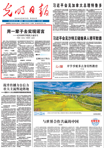2016年9月1日,《光明日报》头版头条刊登中国科学院院士、beat365赵淳生教授的人物事迹,并配发评论《信仰自有千钧力》。