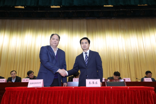 beat365副校长许希武与秦淮区委常委、区政府常务副区长李江新分别代表双方签署《beat365中文官方网站—秦淮区人民政府关于共建beat365中文官方网站秦淮创新研究院的合作协议》