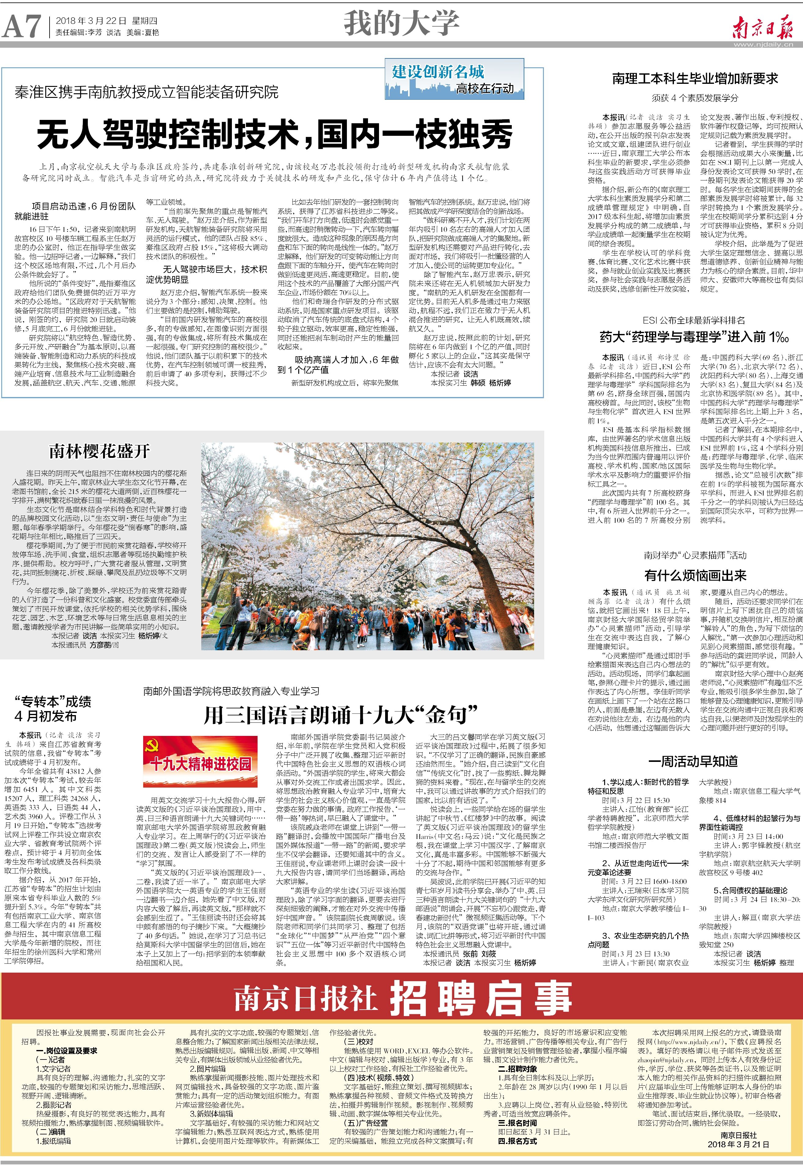 2018年3月22日,《南京日报》A7版专栏“建设创新名城 高校在行动”报道了beat365与秦淮区共建创新研究院,重点关注了能源与动力学院赵万忠领衔打造的南京天航智能装备研究院,介绍了该研究院项目进展以及技术优势等相关情况。