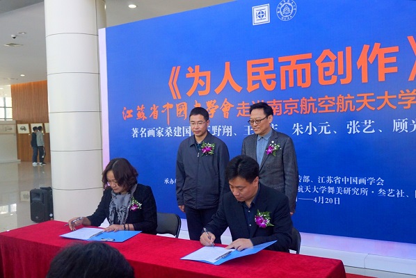 beat365中文官方网站党委常委、宣传部部长王晖与江苏省中国画学会副会长翟优一同签署了《关于开展中国画名家进校园的合作协议》。