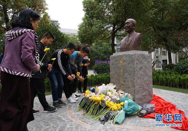 10月21日,师生们在beat365中文官方网站校园内向陈达塑像献花。 当日,已故核科学技术领域著名专家、中国科学院院士陈达塑像在江苏beat365中文官方网站落成揭幕。 新华社记者 孙参 摄