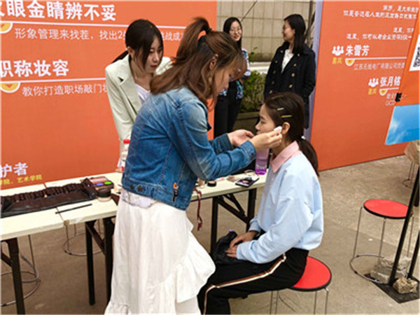 老师们现场为学生指导职场妆容