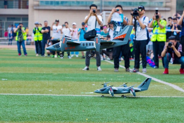 只要轻轻推动开关,就可以实现两种模式的自如切换,“V44”新型垂直起降战斗机是现场飞行器的佼佼者。这架模型战斗机既能像直升机一样垂直起飞,原地悬停,也能像固定翼飞机一样进行高速前飞,这也是目前国内市场上首个研发成功的垂直起降模型战斗机。