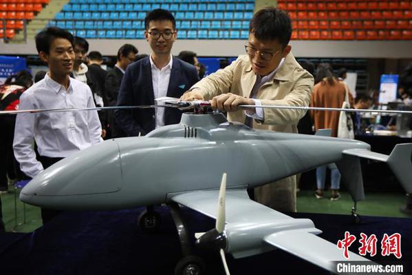 展示的无舵面涵道式垂直起降无人机。 泱波 摄