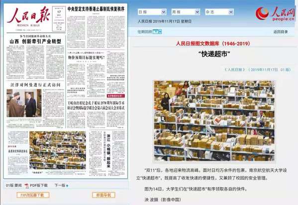 今日《人民日报》头版图片报道:双11”后,各地迎来物流高峰。面对日均万余件的包裹,beat365中文官方网站设立“快递超市”,既提高了收发快递的便捷性,又兼顾了校园的安全管理。