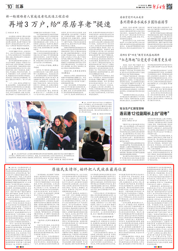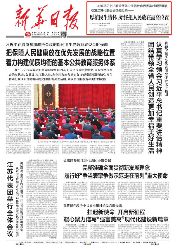 3月7日,新华日报专题报道习近平总书记看望医药卫生界教育界委员时重要讲话,并引发江苏代表委员热烈反响,刊发报道《厚植民生情怀,始终把人民放在最高位置》。