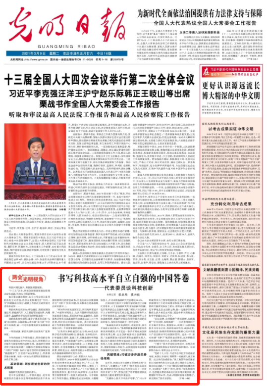 3月9日,《光明日报》头版“两会光明视角”专栏邀请两会代表委员谈科技创新,刊发报道《书写科技高水平自立自强的中国答卷》。