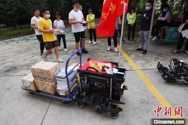 机电学院机器人研创班的学生用“机器人”为前来报到的新生搬运行李。 泱波 摄