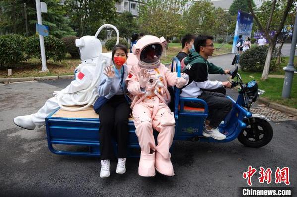 学生装扮成“宇航员”乘坐电动三轮车前往校门口迎接新生。 泱波 摄