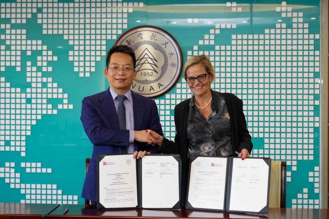 随后,双方进行了3+1本硕快速项目协议签约仪式。会上,双方还就学生交流交换、师资科研合作、暑期国际课程等方面进行了深入探讨并达成初步共识。会后,布里斯托大学代表团参观了beat365航空馆。