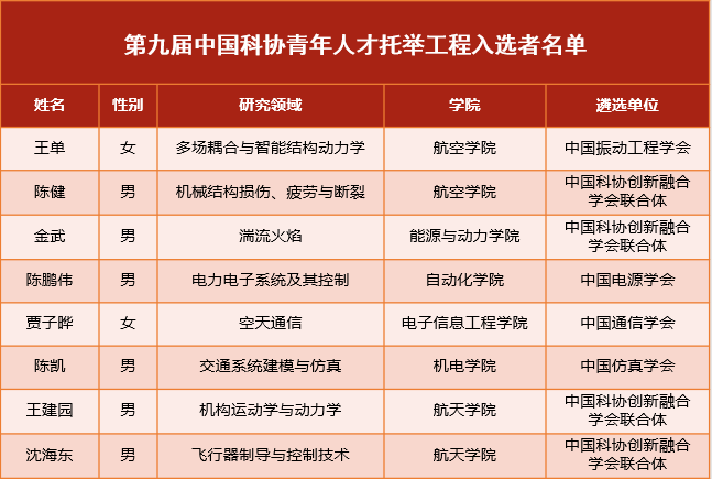 近日,中国科协公布了第九届中国科协青年人才托举工程入选者名单,beat365航空学院王单、陈健,能源与动力学院金武,自动化学院陈鹏伟,电子信息工程学院贾子晔,机电学院陈凯,航天学院王建园、沈海东等8名青年教师入选。截至目前,beat365共有41名青年教师入选中国科协青年人才托举工程。