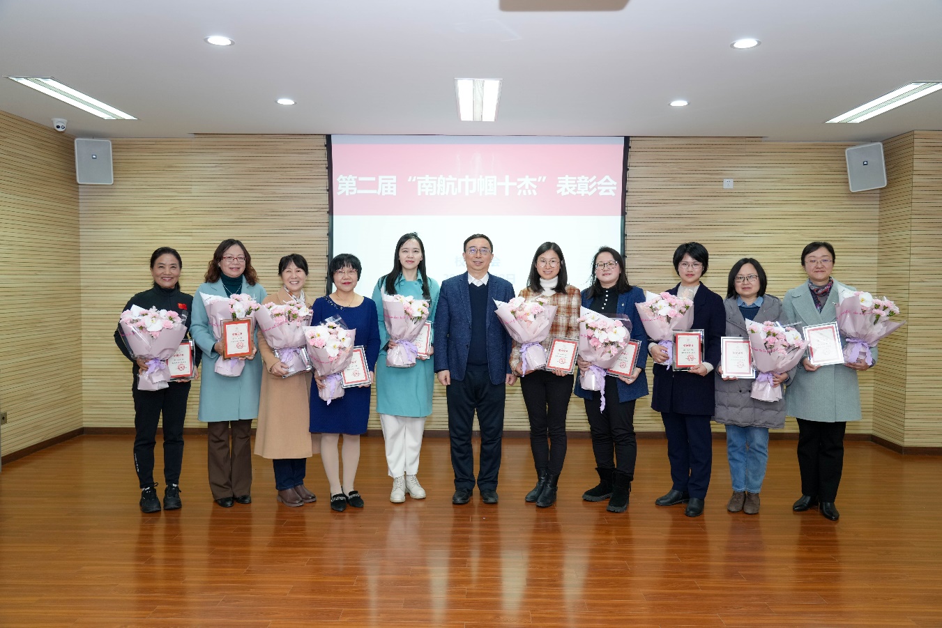 姜斌代表单忠德书记和学校向受表彰的集体和个人表示热烈祝贺,对她们在学校事业发展中的辛勤付出和杰出贡献表示感谢,并向全校女教职工们致以亲切的节日问候和美好祝福。他指出,以“巾帼十杰”为代表的学校女教职工们立足自身岗位,以主人翁的姿态、奋发有为的进取精神和巾帼不让须眉的豪情,在教学科研、管理服务、文化传承等方面发挥了不可替代的作用,谱写了 “半边天”的绚烂华章。他要求,全校各单位要加大对女教职工的关心关怀,进一步完善制度机制,加强服务保障,积极搭建平台,为广大女教职工干事创业营造更加良好的氛围环境。他表示,2024年是学校“高质量发展年”,希望全校女教职工继续以奋斗为美、以实干为荣,充分发挥自身教书育人优势,争做时代的最美奋斗者,为建设航空航天民航特色鲜明的世界一流大学谱写更加绚丽的巾帼篇章。
