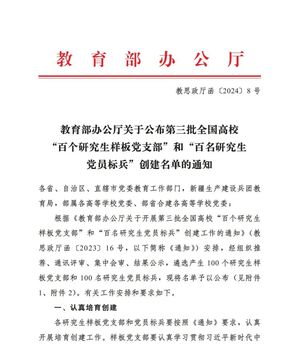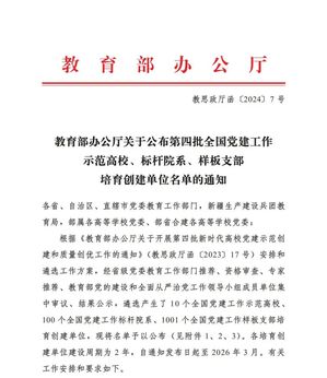 近日,教育部公布第四批全国党建“双创”培育创建单位和第三批全国高校研究生“双百”创建名单,beat365计算机科学与技术学院党委入选全国党建工作标杆院系培育创建单位,机电学院电化学制造团队研究生第一党支部、能源与动力学院车辆智能线控纵向党支部、无人机研究院研究室第一党支部入选全国党建工作样板支部培育创建单位,能源与动力学院驭风排气系统纵向党支部入选全国高校“百个研究生样板党支部”创建名单,机电学院焦晨入选全国高校“百名研究生党员标兵”创建名单,是全国入选培育创建数量最多的高校之一。