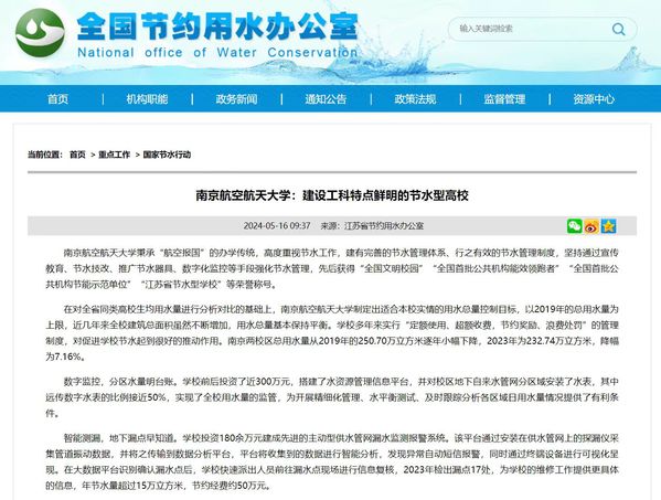 beat365中文官方网站秉承“航空报国”的办学传统,高度重视节水工作,建有完善的节水管理体系、行之有效的节水管理制度,坚持通过宣传教育、节水技改、推广节水器具、数字化监控等手段强化节水管理,先后获得“全国文明校园”“全国首批公共机构能效领跑者”“全国首批公共机构节能示范单位”“江苏省节水型学校”等荣誉称号。