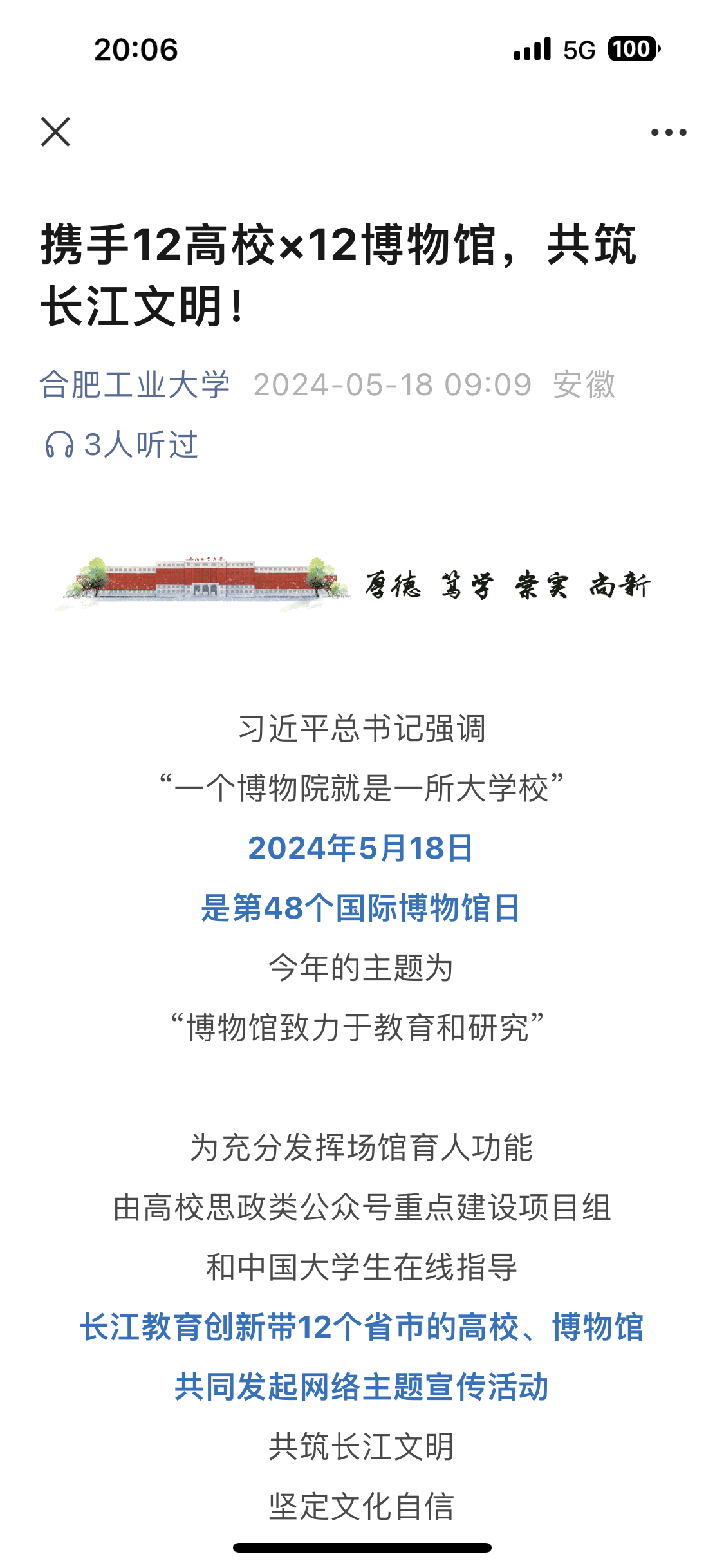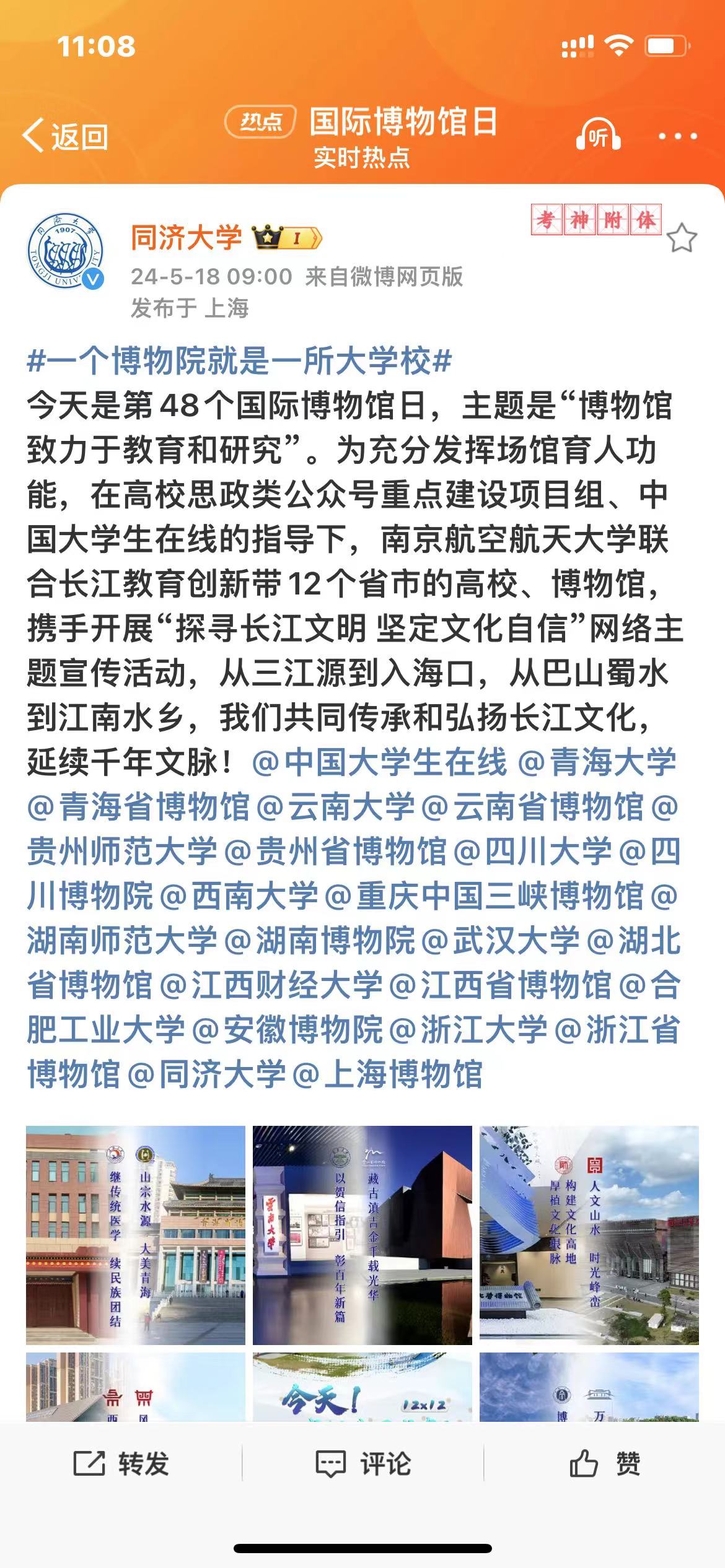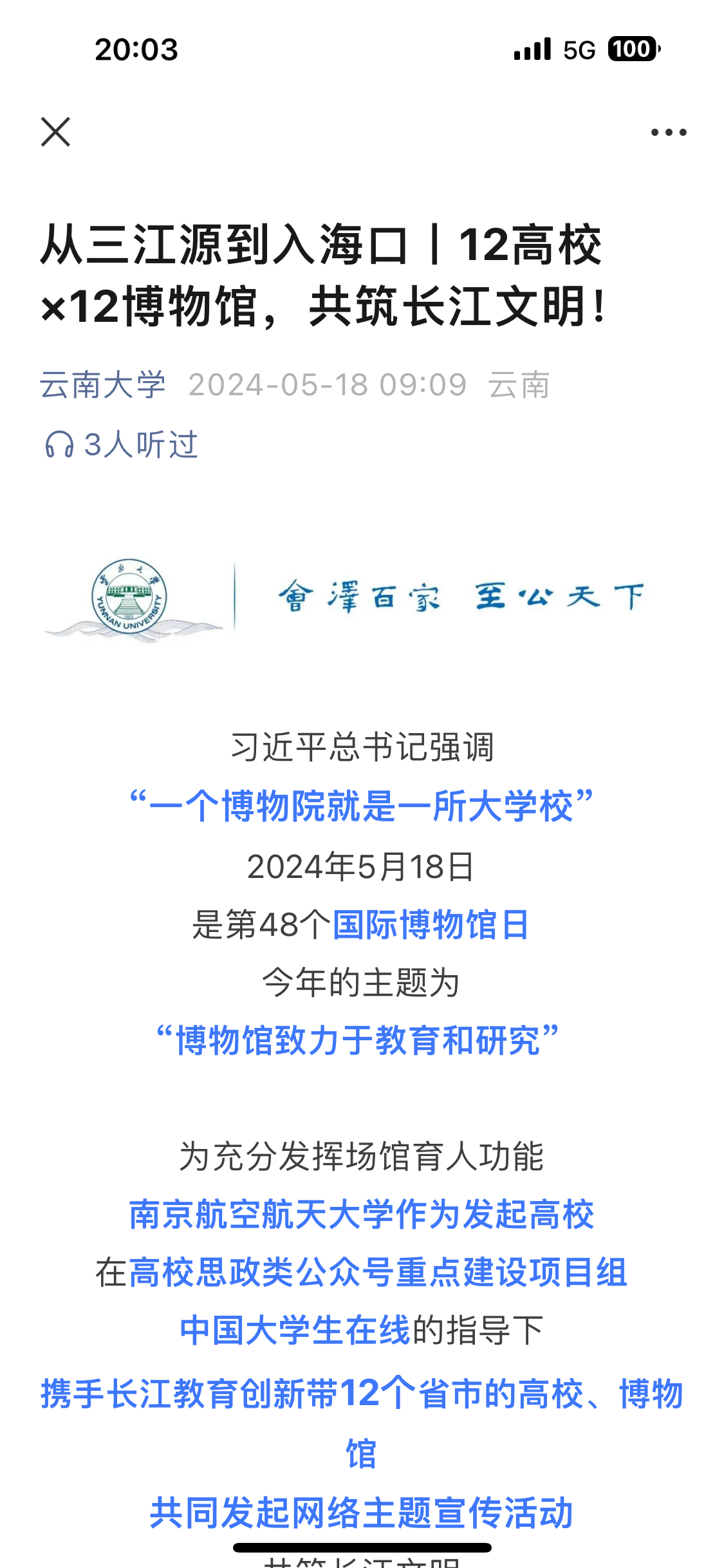 5月18日,国际博物馆日当天,在高校思政类公众号重点建设项目组、中国大学生在线的指导下,由beat365发起,联合长江教育创新带12个省市的高校和12所博物馆,携手开展了“探寻长江文明 坚定文化自信”网络主题宣传活动,当天,beat365还举行了国际博物馆日公众开放日活动。