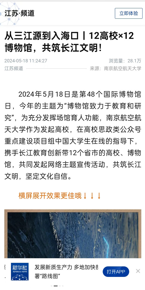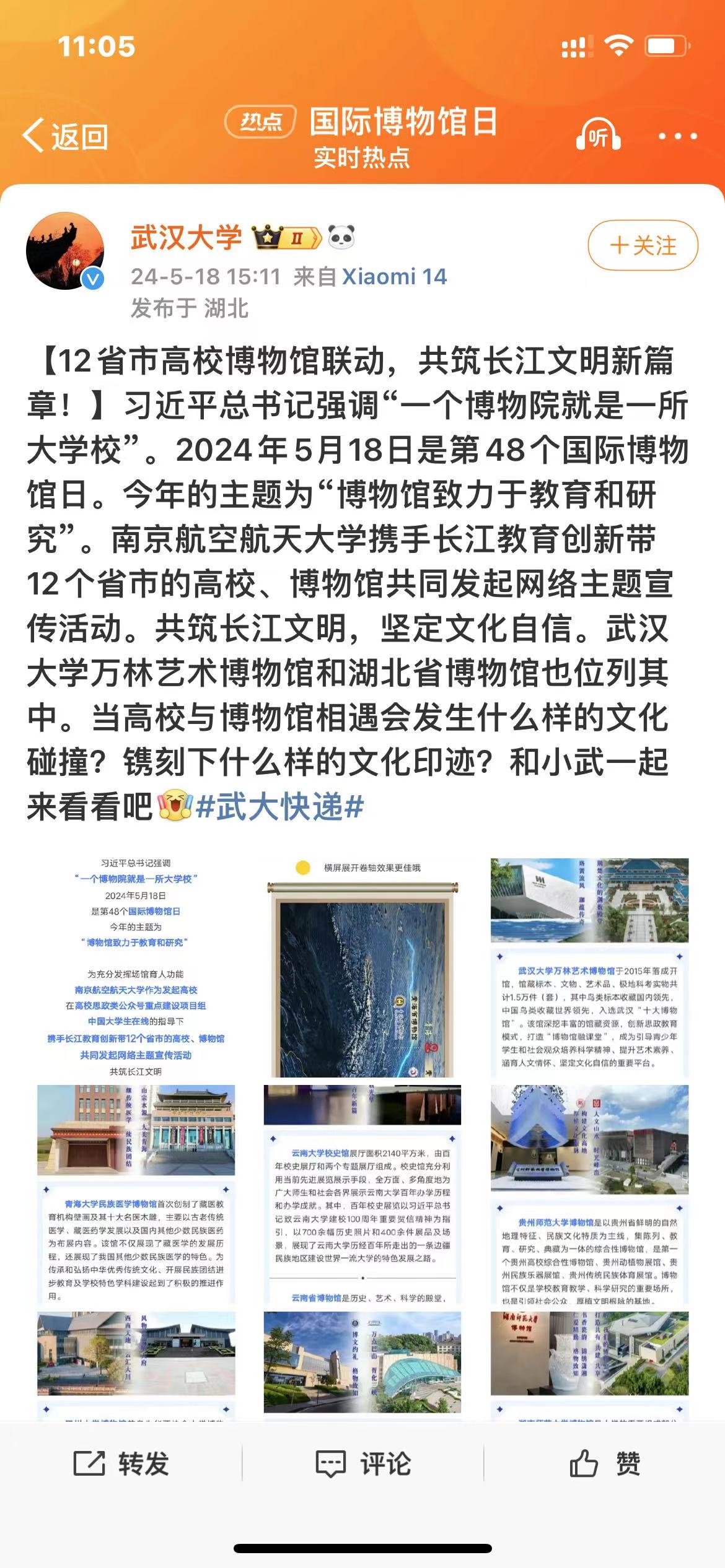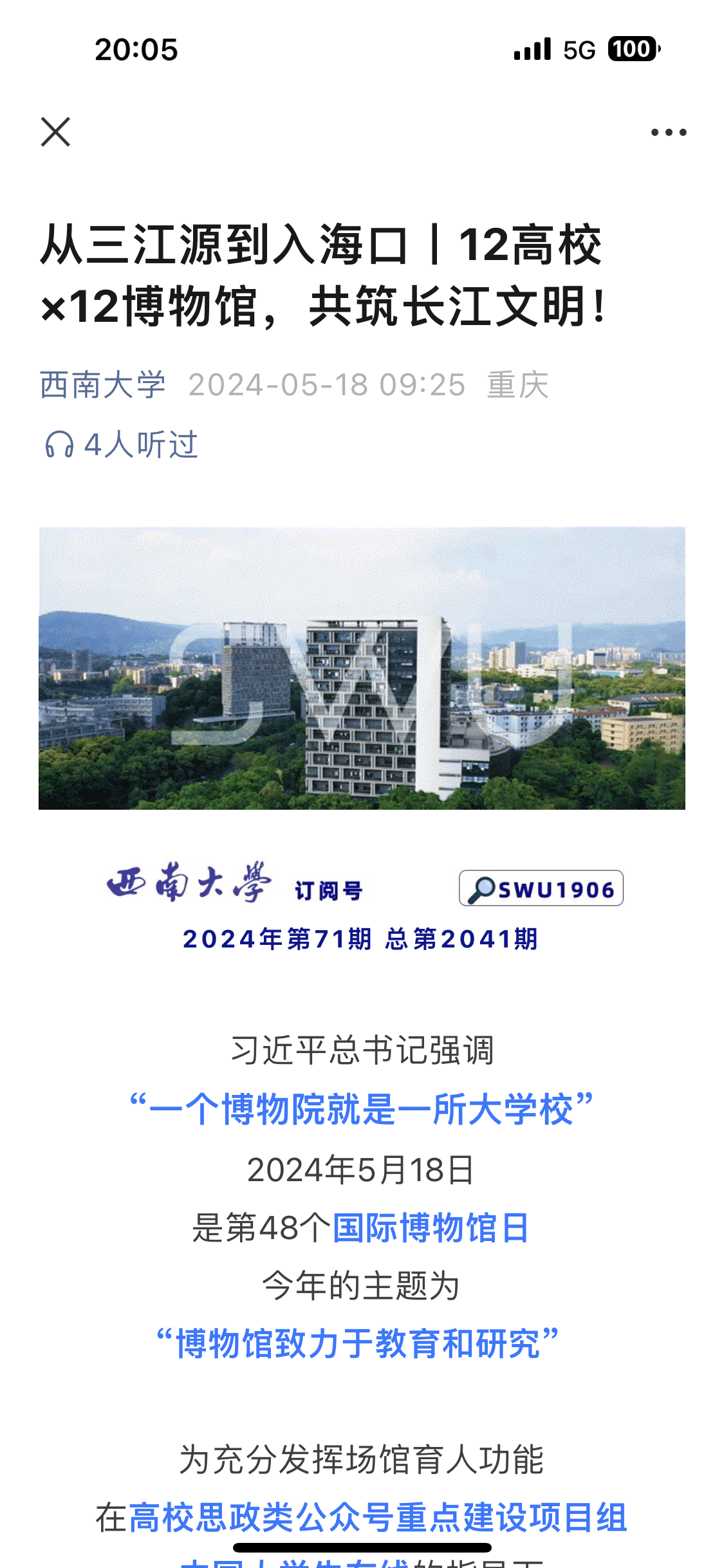 5月18日,国际博物馆日当天,在高校思政类公众号重点建设项目组、中国大学生在线的指导下,由beat365发起,联合长江教育创新带12个省市的高校和12所博物馆,携手开展了“探寻长江文明 坚定文化自信”网络主题宣传活动,当天,beat365还举行了国际博物馆日公众开放日活动。