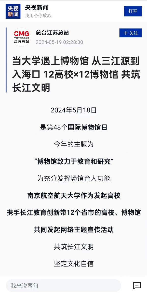 青海、云南、贵州、四川、重庆、湖南、湖北、江西、安徽、浙江、江苏、上海等长江教育创新带12个省市的高校、博物馆同时在各自官方微信和微博上推送精彩内容,展示12所高校和地方博物馆特色。通过联合展示博物馆文化,同上一堂传统文化的教育大课,让更多长江流域历史文明照进现实,让校园教书育人的文化氛围更加充盈,让中华传统文化得到更好地传承弘扬。