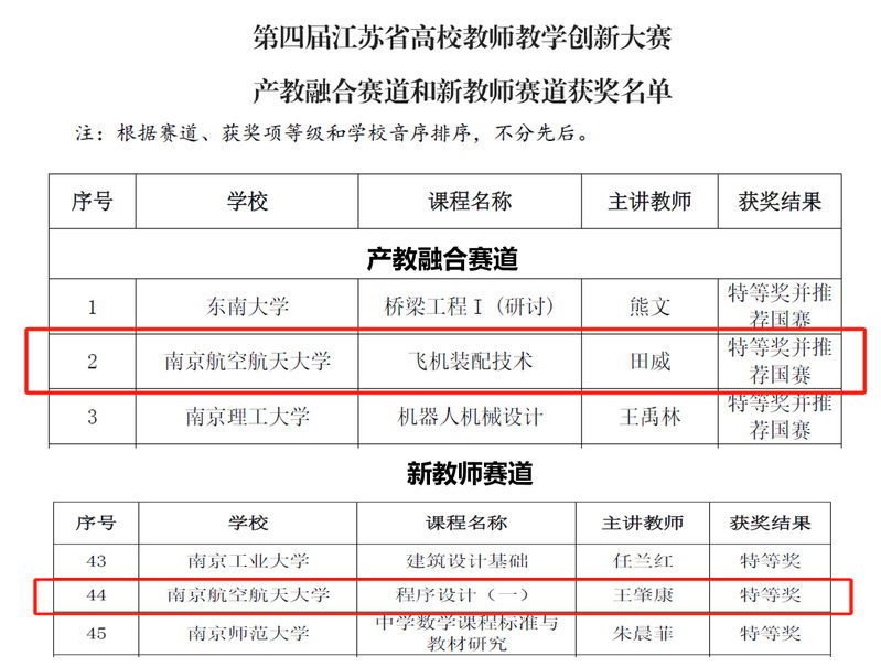 近日,第四届江苏省高校教师教学创新大赛产教融合赛道及新教师赛道获奖名单公布,beat365进入现场决赛的两位教师均获省特等奖,其中机电学院田威教授的《飞机装配技术》荣获产教融合赛道特等奖并推荐国赛,计算机科学与技术学院王肇康副教授的《程序设计(一)》荣获新教师赛道特等奖。至此,beat365在本届江苏省高校教师教学创新大赛中共获得5项特等奖,其中3项推荐国赛,推荐国赛总数名列全省并列第一。
