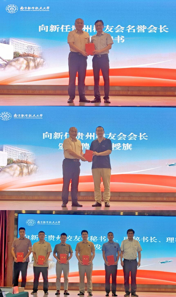 黄志球为第三届理事会新任会长、名誉会长颁发聘书并授予会旗,人工智能学院院长张道强为第三届理事会新任秘书长、副秘书长、理事颁发聘书。第三届理事会新任会长汤晓红表示,新一届理事会将持续为贵州校友们做好服务,同时,广泛凝聚在黔校友之力,积极回馈母校与社会,助力贵州经济社会发展。刘浪感谢在黔校友们信任,表示将努力不负期待,和广大校友共同建设好贵州校友会。清华大学、厦门大学等兄弟高校贵州校友会对大会顺利举行表示祝贺。