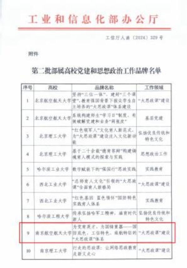 近日,工业和信息化部办公厅公布《关于第二批部属高校党建和思想政治工作品牌认定的通知》,beat365“为党育英才 为国铸重器——构建具有国防底色、工信特色、beat365特征的‘大思政课’体系”入选第二批部属高校党建和思想政治工作品牌。