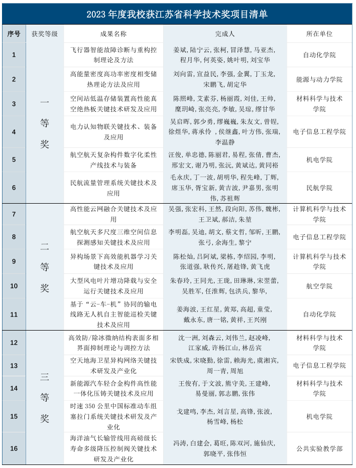 自动化学院姜斌教授团队牵头的“飞行器智能故障诊断与重构控制理论及方法”项目、能源与动力学院刘向雷教授所在团队牵头的“高能量密度高功率密度相变储热理论方法及应用”项目、材料科学与技术学院陈照峰教授团队牵头的“空间站低温存储装置高性能真空绝热板关键技术研发及应用”项目、电子信息工程学院吴启晖教授团队牵头的“电力认知物联关键技术、装备及应用”项目、机电学院汪俊教授所在团队牵头的“航空航天复杂构件数字化柔性产线技术与装备”项目、民航学院胡明华教授团队参与的“民航流量管理系统关键技术及应用”项目荣获江苏省科学技术奖一等奖。