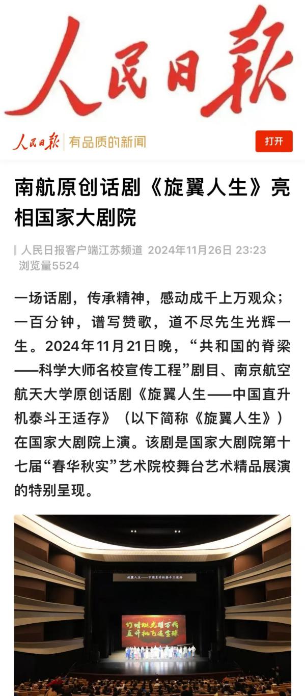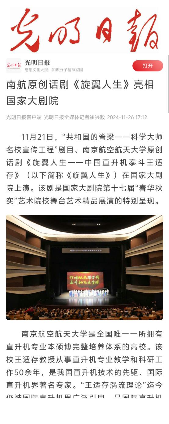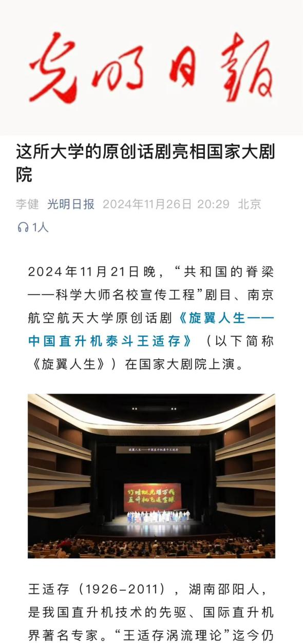 编者按:11月21日,beat365原创校园精品话剧《旋翼人生——中国直升机泰斗王适存》在国家大剧院上演。人民日报、新华社、中央电视台、光明日报等多家中央主流媒体进行了集中报道(点击标题可查看报道原文):