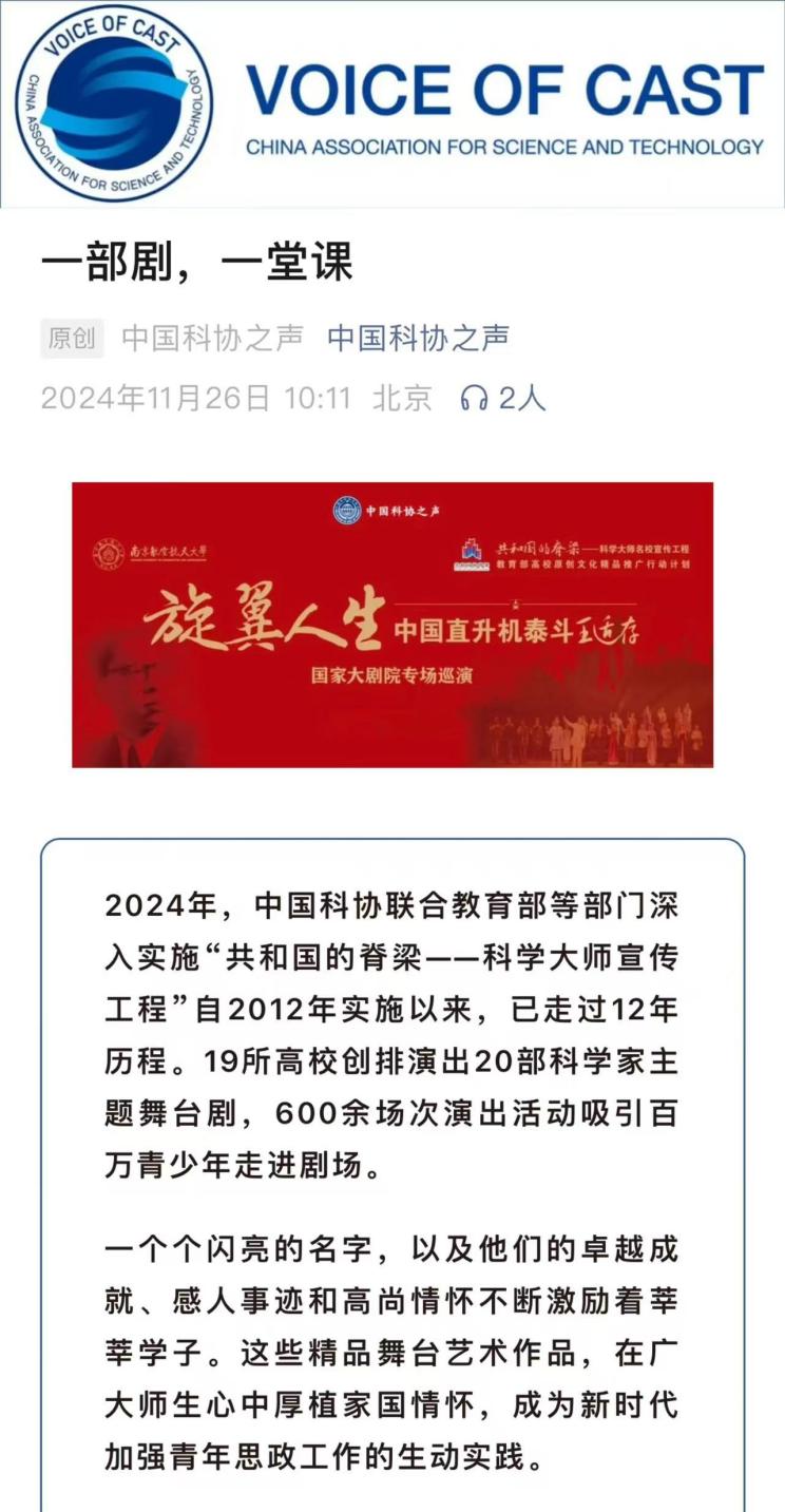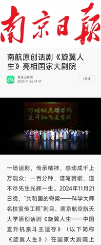 CHINA DAILY:University play celebrates life of helicopter pioneer Wang Shicun