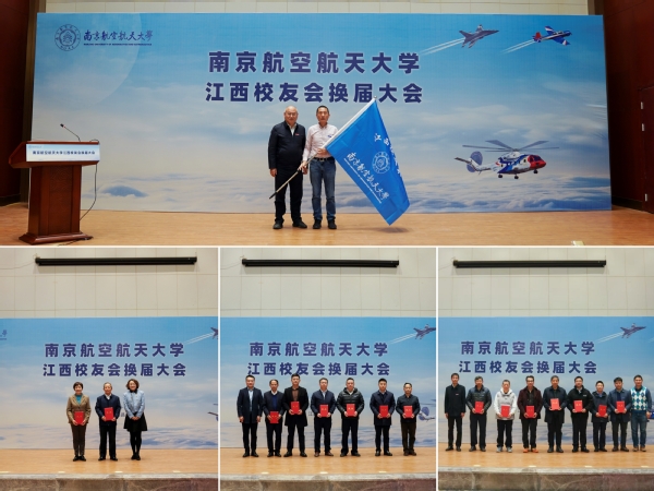 黄志球为新任会长颁发聘书并授予会旗,王晖为新任顾问代表颁发聘书,李和新为新任副会长、秘书长、副秘书长代表颁发聘书,机电学院党委书记刘虎、计算机科学与技术学院江西招生组组长、信息化处副处长谢健为新任理事代表颁发聘书。
