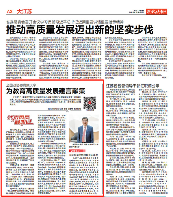 编者按:3月1日,《现代快报》刊发全国政协委员、副校长施大宁采访文章《履职记|全国政协委员施大宁:为教育高质量发展建言献策》。现转发全文如下: