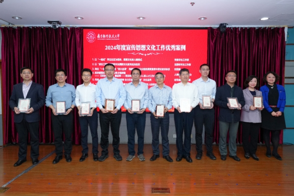 崔海涛为2024年度校园微信公众号综合影响力排行榜TOP10获奖集体颁奖,王晖为2024年度宣传思想文化工作优秀案例颁奖,李遥为2024年度宣传思想文化工作先进个人颁奖,并为第三批院级党委理论学习中心组、文化建设示范单位授牌。