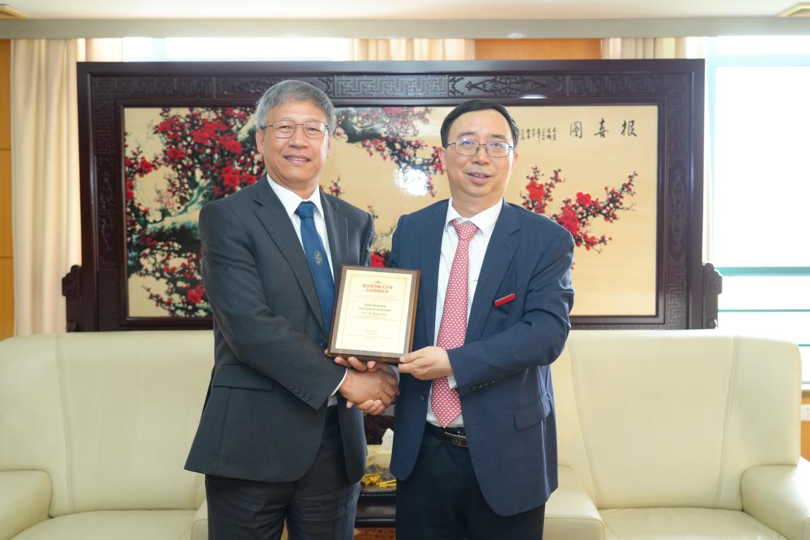 姜斌对诸自强院士来校合作交流表示热烈欢迎,在名誉教授受聘仪式上,为其颁发beat365名誉教授聘书并佩戴校徽。他指出,长期以来,诸自强院士及其团队在科学研究、人才培养、学术交流等方面,为beat365提供了强有力的支持与帮助,诚挚希望诸自强院士充分发挥自身卓越的学术影响力与国际号召力,继续为beat365的高质量发展建言献策,注入更多智慧与活力。