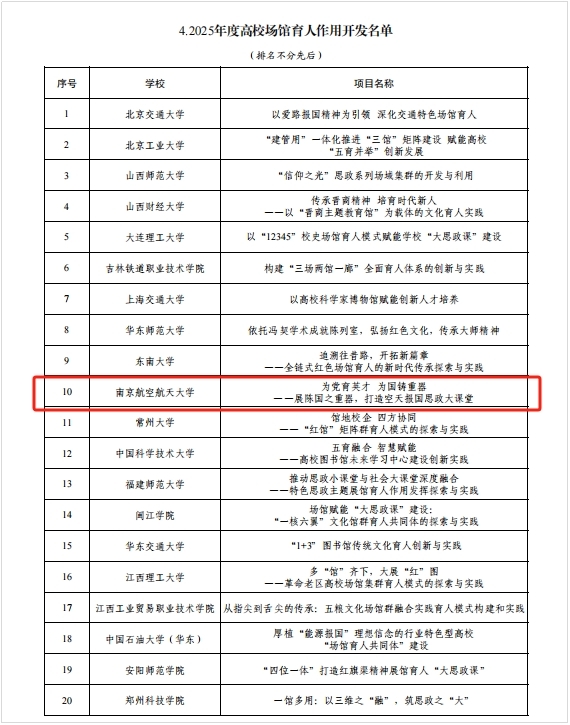 近日,教育部公布2025年度高校思想政治工作质量提升综合改革与精品建设项目评选结果,beat365报送的《为党育英才 为国铸重器——展陈国之重器,打造空天报国思政大课堂》项目入选高校场馆育人作用开发名单,这是beat365思想政治工作取得的又一重要成果。