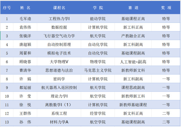 能源与动力学院毛军逵、计算机科学与技术学院袁伟伟、航天学院张镜洋、自动化学院唐超颖、周翟和、物理学院顾晓蓉、马克思主义学院曹清华7位教师荣获特等奖,计算机科学与技术学院许娟等4位教师荣获一等奖,经济与管理学院王群伟等2位教师荣获二等奖。