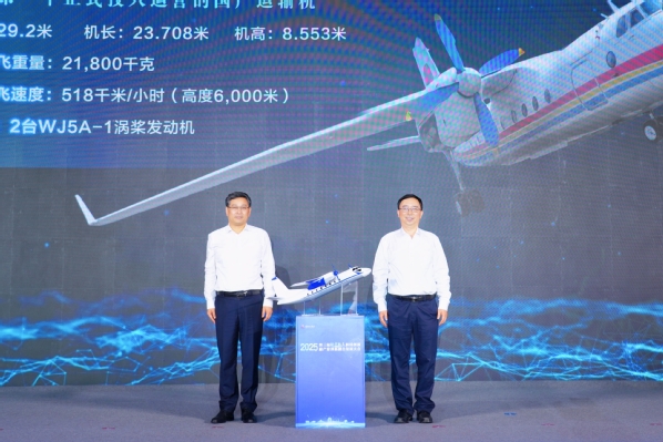 姜斌、董涵代表校地双方交接即将落地创新港的运-7飞机。