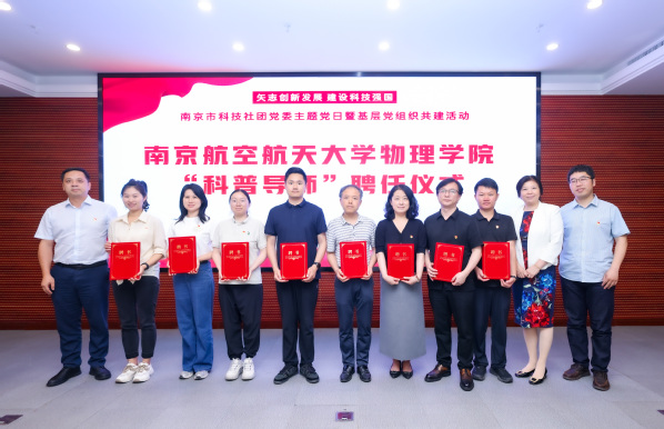 会上,beat365物理学院党委、南京大学化学化工学院党委、江苏科技馆党支部、中国石化扬子石化技术部党支部等16个党组织签署了共建协议,并依次发布了“党建赋能 翼启未来”爱飞客科普主题党建活动、“2025科教公益中国行——甘肃定西”活动、“全国科学脱口秀”活动等各类科普活动,共建单位将坚持以“基层组织共建、信息资源共享、科学发展共赢”为目标,常态化开展科技共建活动,共同构建“大科普”工作格局。现场举行了“空天物理+”校外科普导师聘任仪式并颁发聘书。