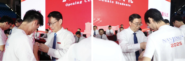 开学典礼在庄严的国歌声中拉开帷幕。全体校领导和嘉宾为2025级研究生新生代表佩戴beat365校徽,台下全体新生共同佩戴校徽,宣告自己成为一名真正的beat365人。