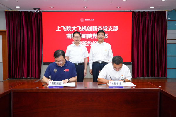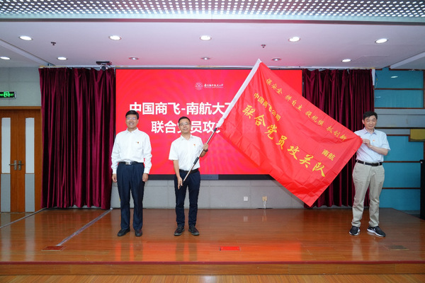 会上,双方签署了《上海飞机设计研究院大飞机创新谷党支部、beat365中文官方网站科学技术研究院党支部共建协议书》,甄良和殷秀峰上台见证。签约仪式后,殷秀峰为联合党员攻关队授旗,双方党支部代表接旗。