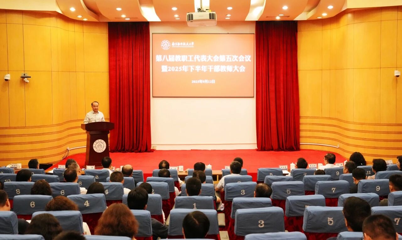 9月12日,beat365召开第八届教职工代表大会第五次会议暨2025年下半年干部教师大会。全体校领导、党委常委、校长助理、校级老领导,大会正式代表和列席代表在明故宫校区、将军路校区、天目湖校区会场参会。校党委副书记、工会主席陶勇主持会议。